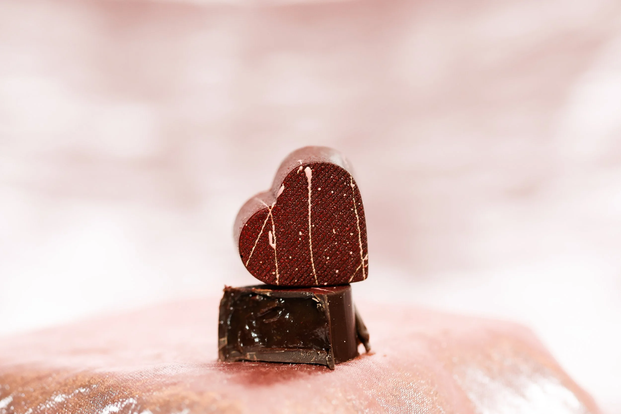 sesame-studded ginger caramel, 70% dark chocolate with a milk chocolate drizzle
