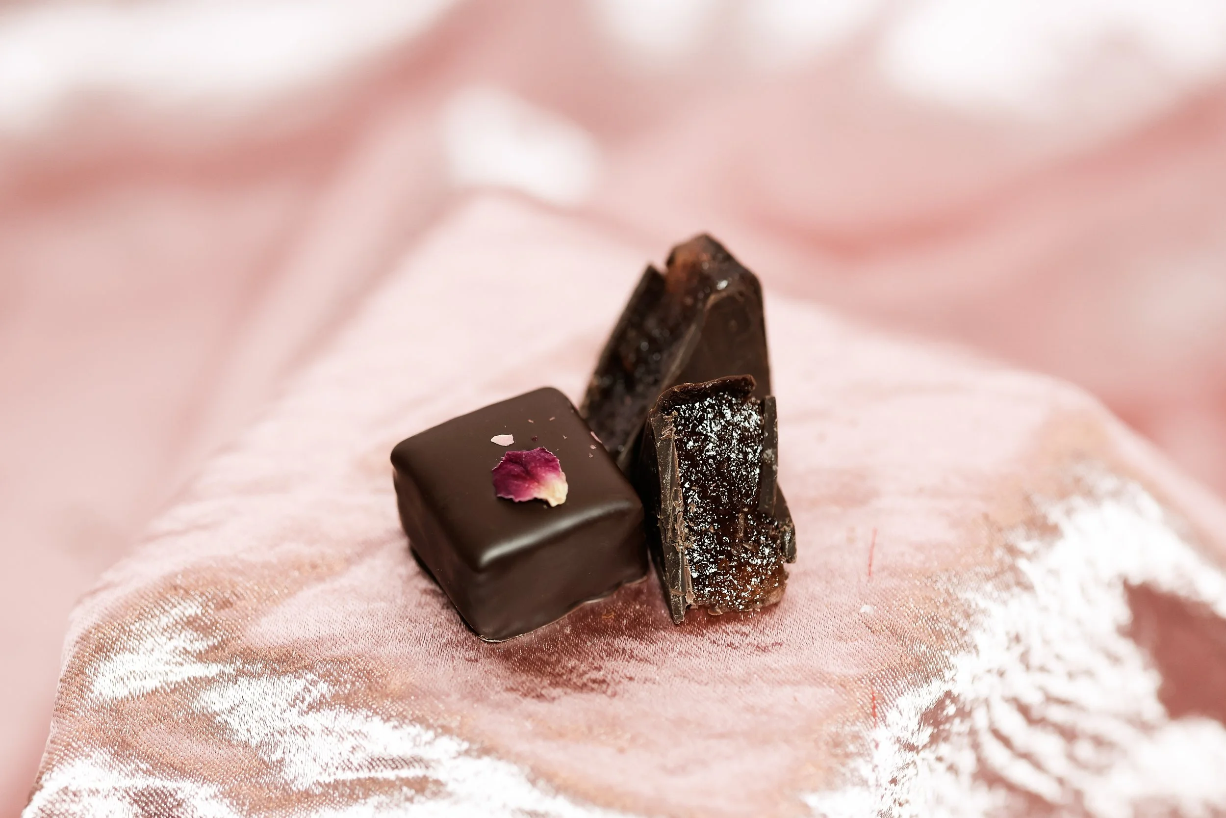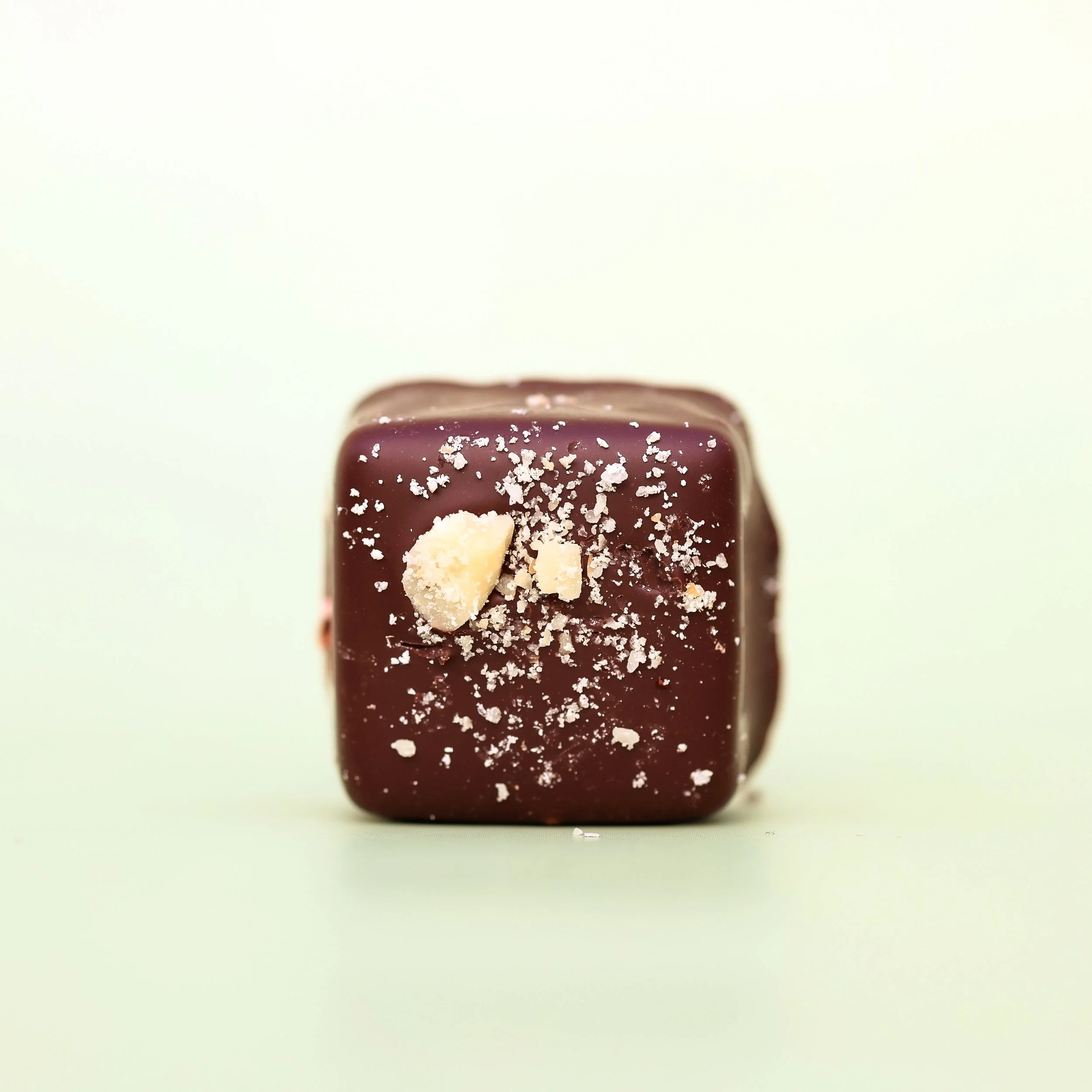 pull-apart caramel, organic + fair-trade Madagascar vanilla beans, enrobed in 70% dark chocolate, Bulls Bay flake salt